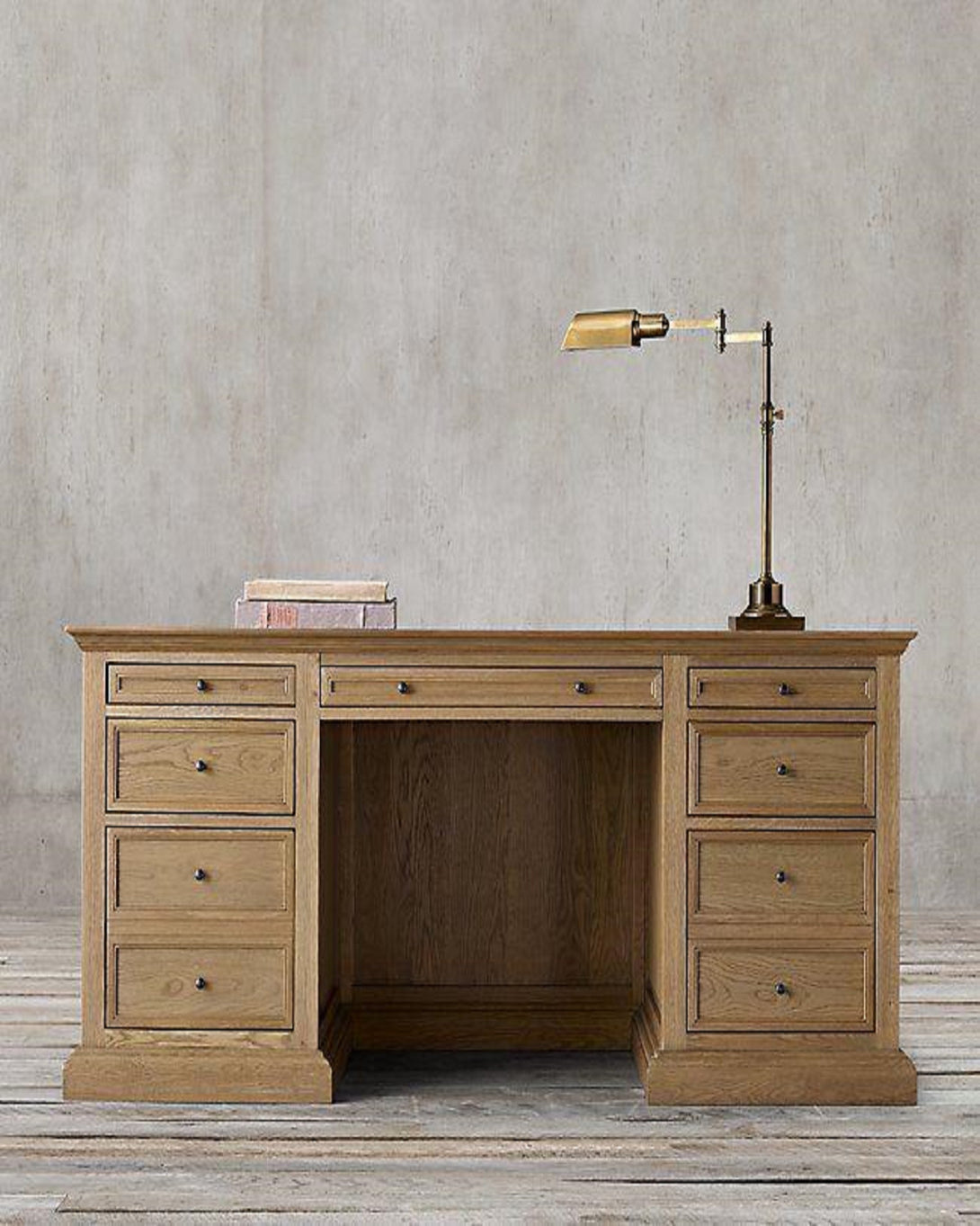 Light colour Classic Desk Made of Board and Laminate with three drawers on the both sides and one in front.