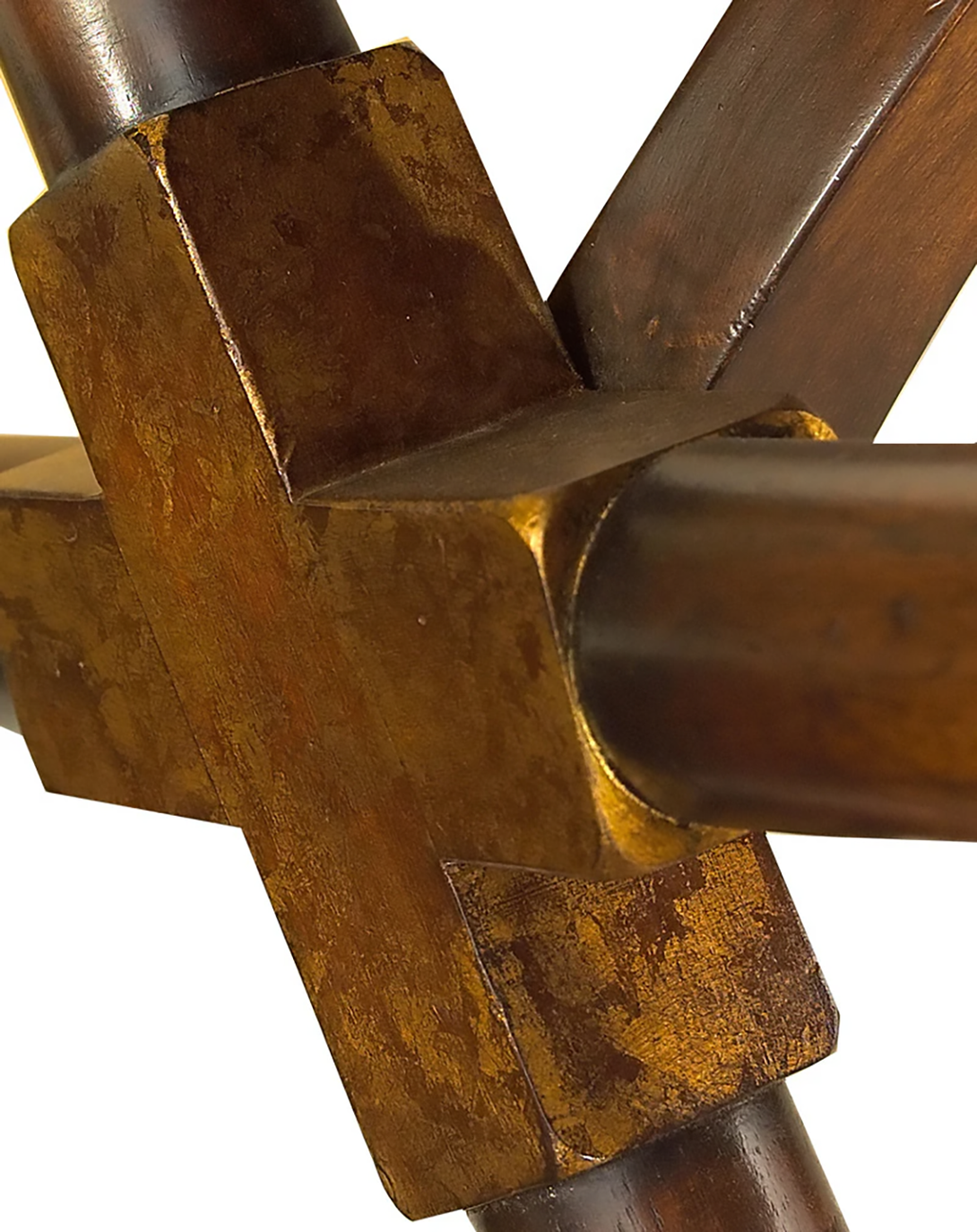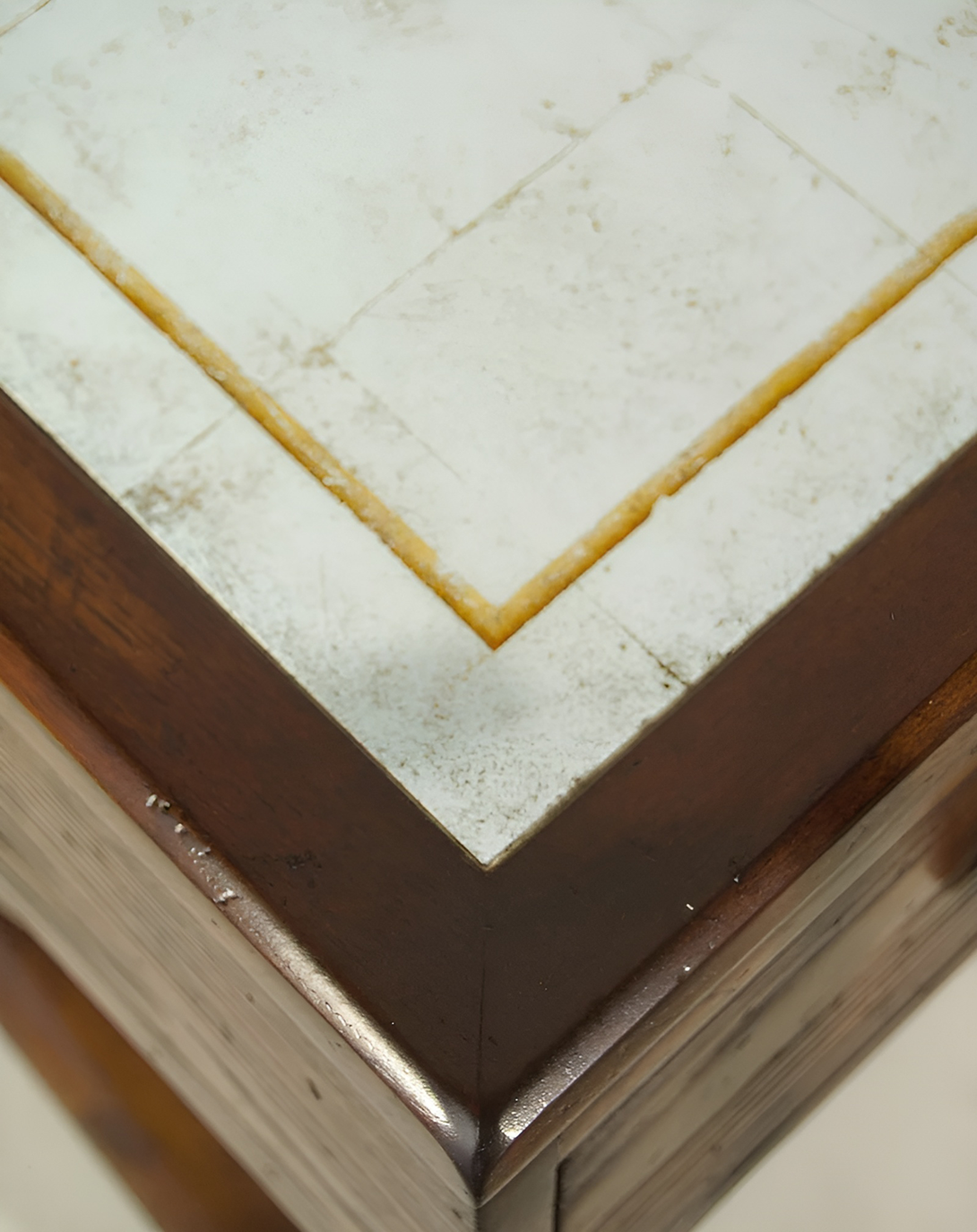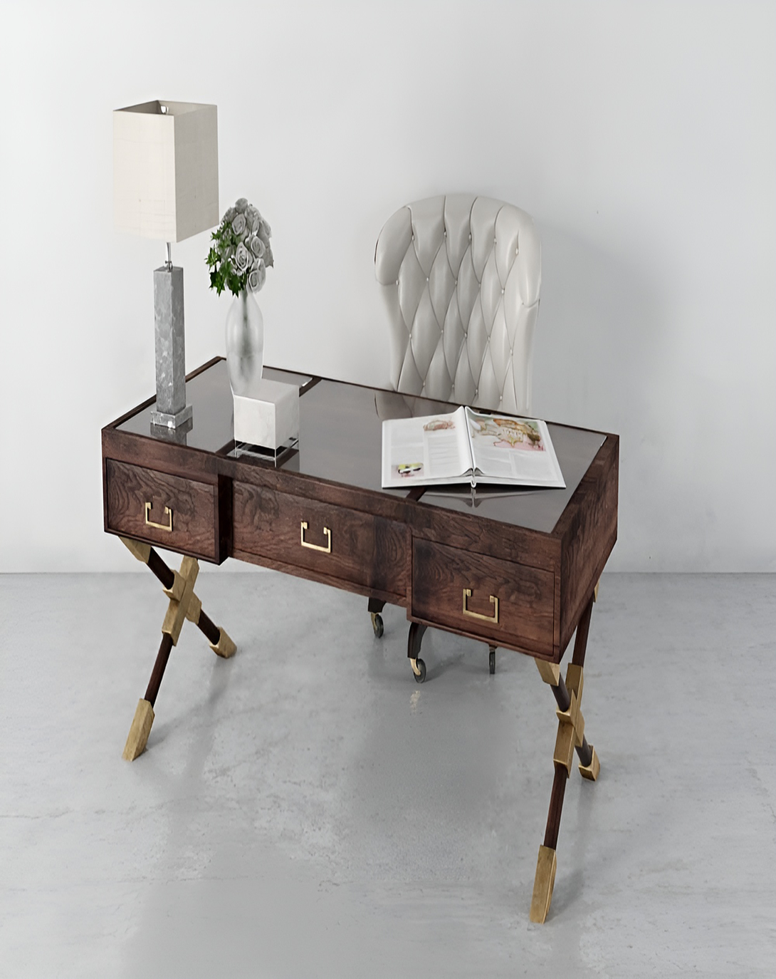 Home at office Desk with walnut Veneer having thin crossed legs with 9 inch drawers on either sides and 1 feet façade. High Gloss finish on the table top with Burl Veneer.