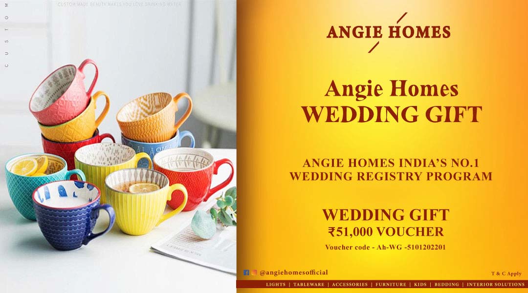 Angie Homes India's No.1 Wedding Registry Program & Gifting a gift card is no less than an awesome wedding gift for your loved ones, with the card as a gift, they can use the amount to shop according to their choices. You can buy the gift voucher in physical form so that you can wrap it and hand it over as a gift, or you can also email the digital card to your loved ones who live far away.