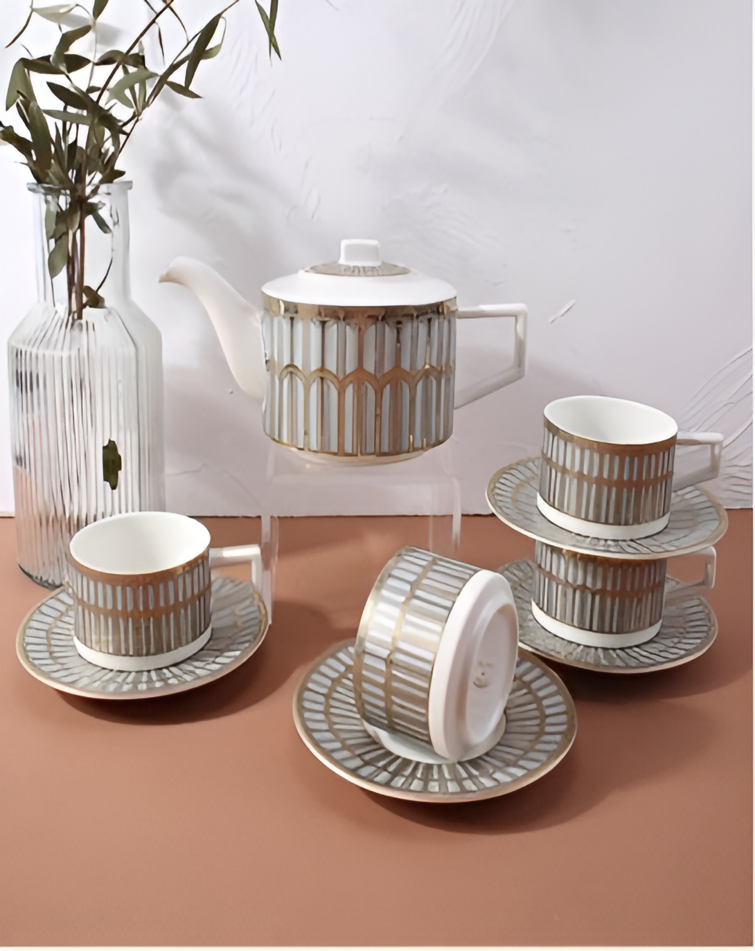 Classic Porcelain and Bone China set with an elegant look to have your Green Tea. it comes with Cup, Saucer and Kettle.