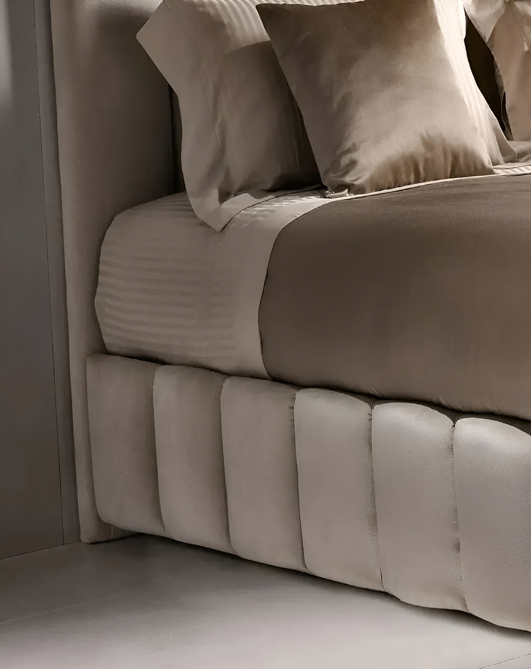 Upholstered Beds are covered in light padding and fabric which gives a textural appeal; they could be made with velvet, leatherette, suede or simple fabric upholstery and typically have tufted or straight streamlined headboards.