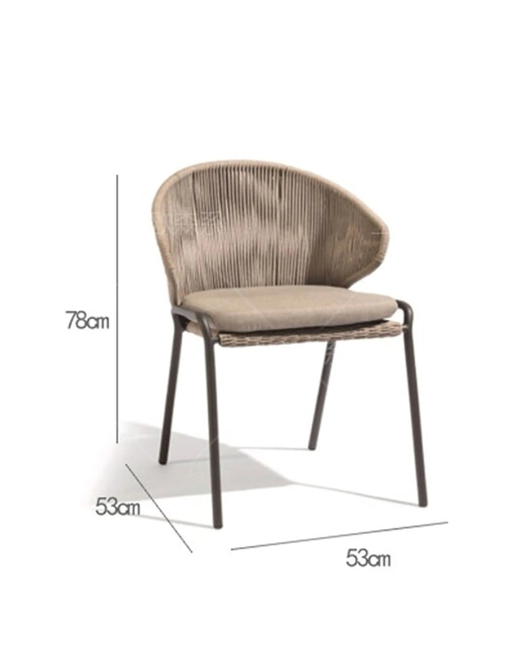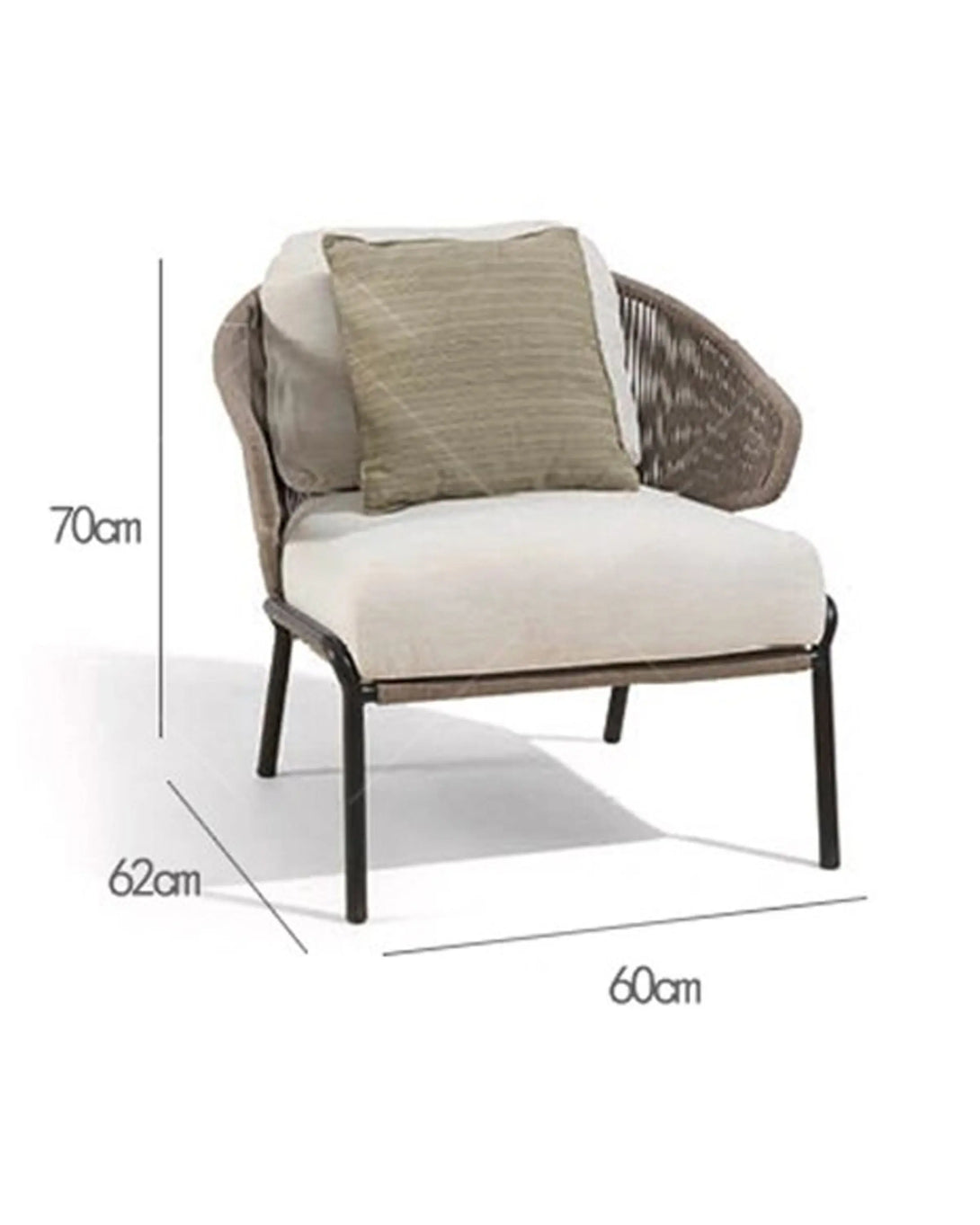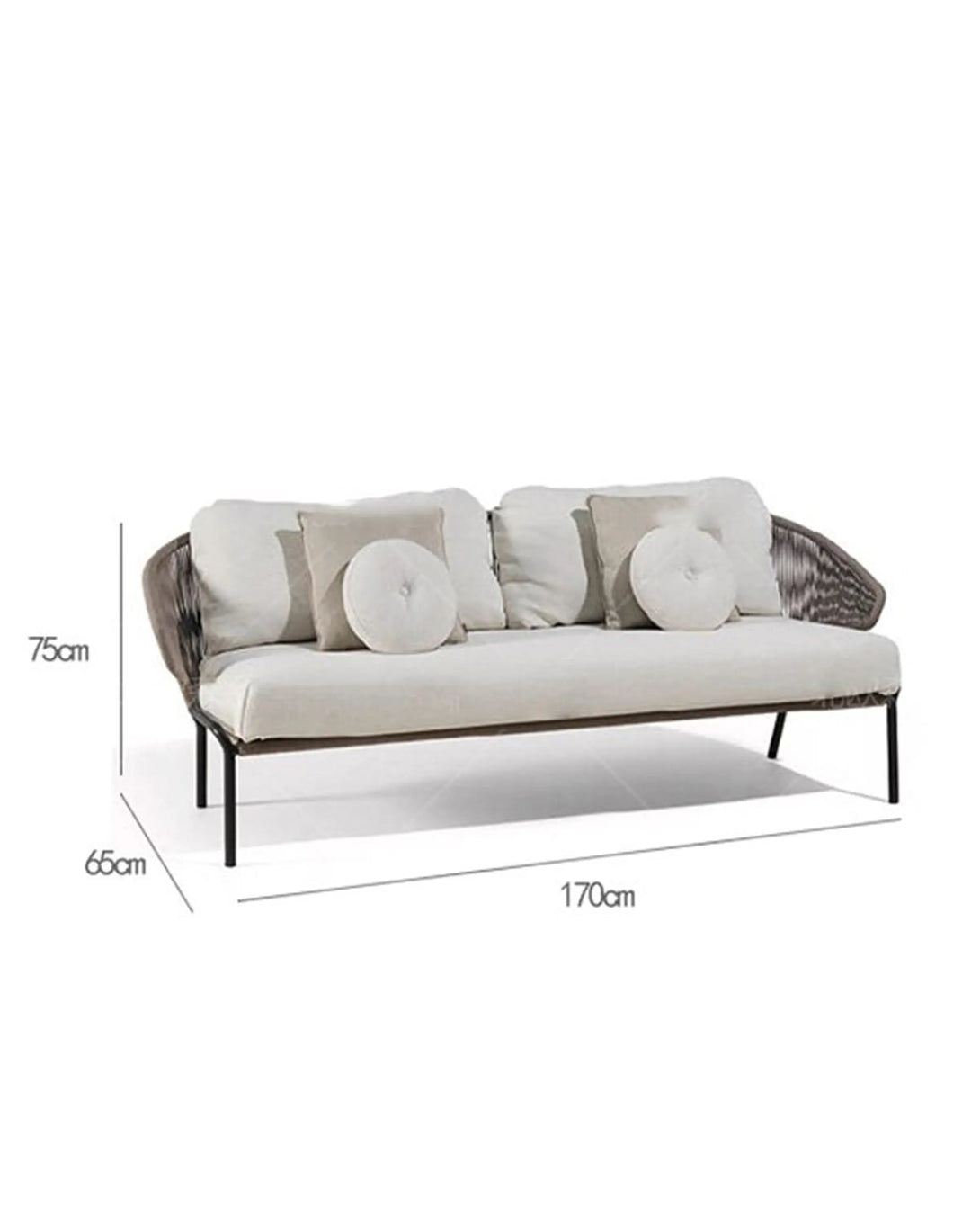 Frame made of thermo-lacquered Lava aluminum, and Bronze or Silver rope. Seat cushion, 2 back cushions, and 5 deco cushions.