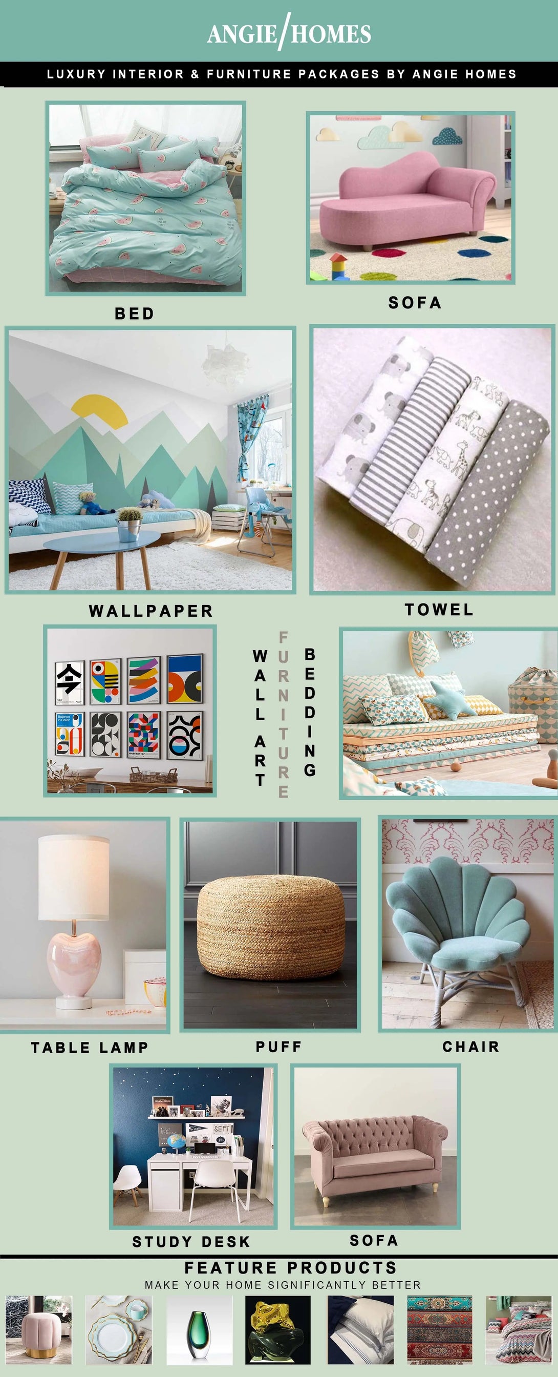 Kids Room Interior Solutions Include -  Double bed with Headboard | 2 Seater Sofa  | Table Chair | Table Lamp | Side Boards | Wall Art | Chandler. We all spend quality time with friends and family. We entertain guests at home | Angie Homes provides. Furniture .. Interiors .. Lights .. Artwork and clock in Kids Rooms.