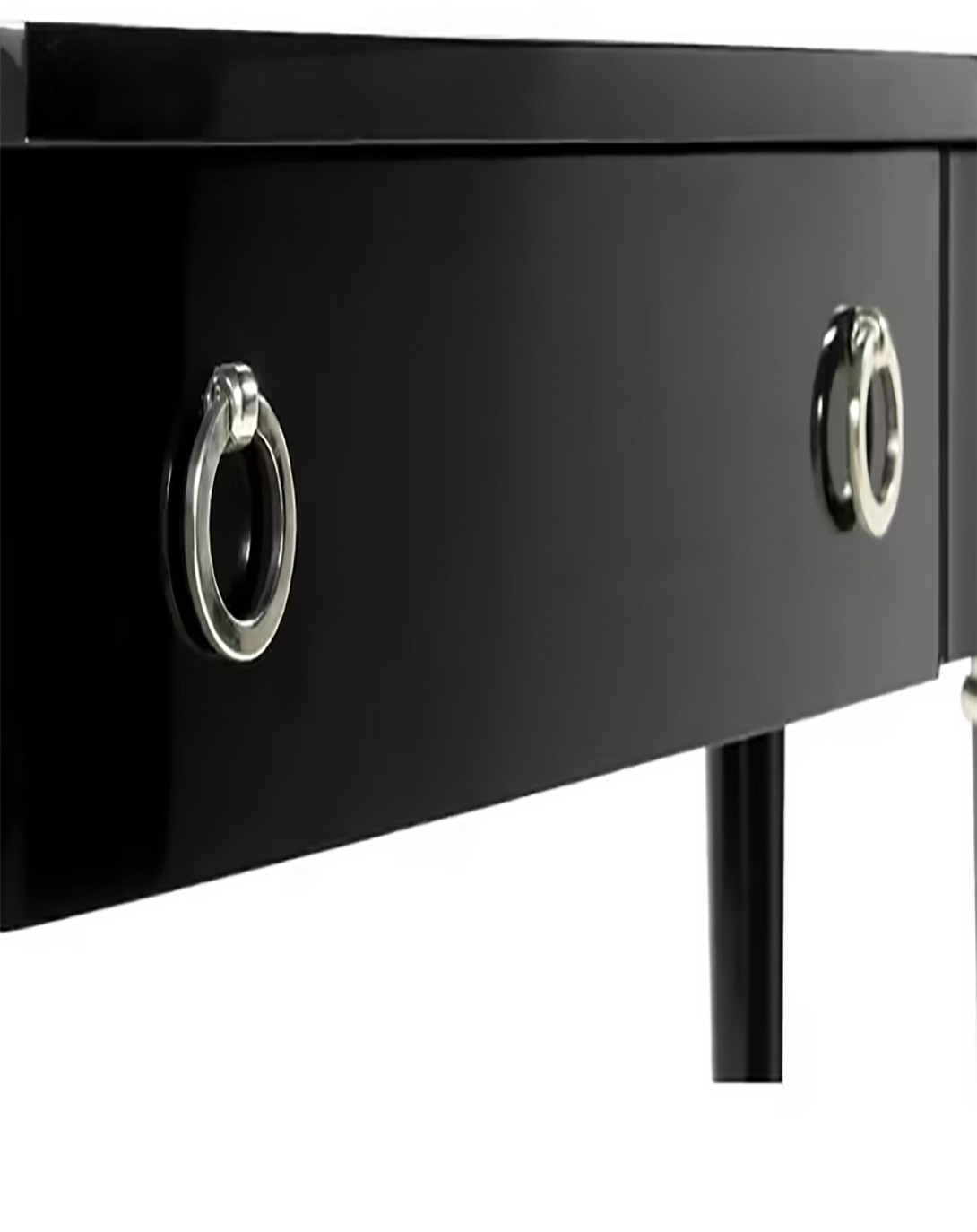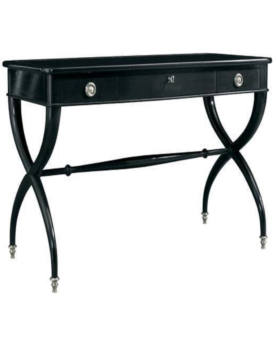 Ominous Dark Grey Desk Made of Board and Laminate with sleek wooden crossed legs and three sleek drawer having Metal Gold Brass finish Knobs.