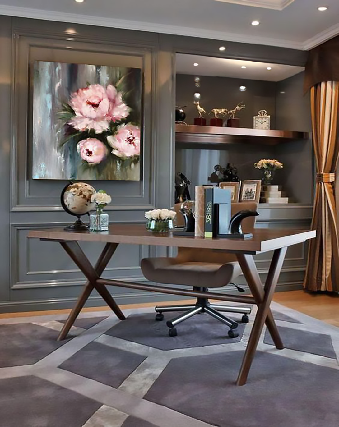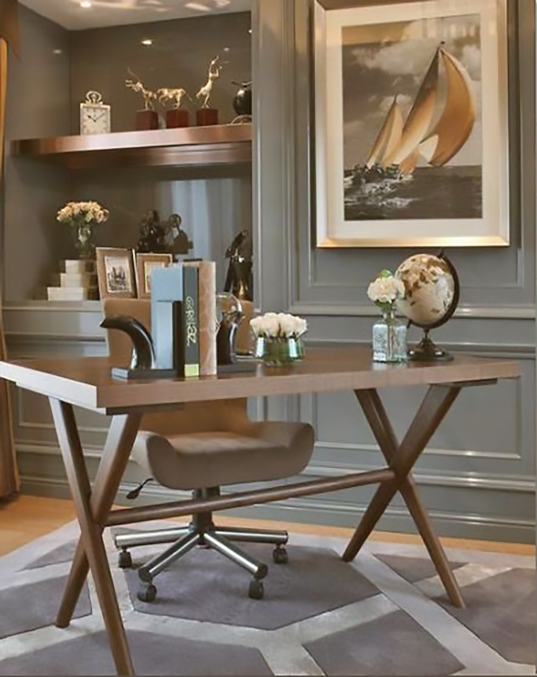 Sumatra Brown Desk: Desk Made of Board and Laminate with three drawers having metal knobs. It has sleek wooden legs