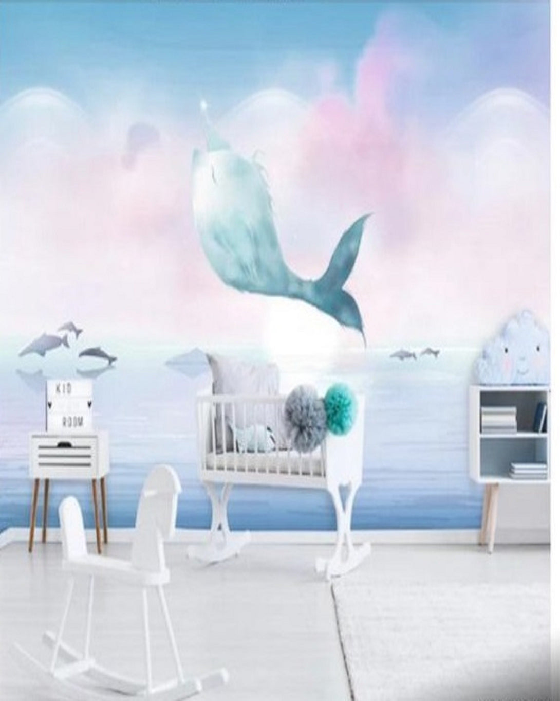 The Blue Whale Wall Paper to Give the Room a Soft Look plenty to discover on this children's wallpaper by Majvillan: Lovingly drawn cows and horses, pigs, rabbits and chickens, lambs and even swans cavort between the farm buildings and flowering trees. The child-friendly design and delicate colours on a white-grey background create a bright, friendly atmosphere in children's rooms.