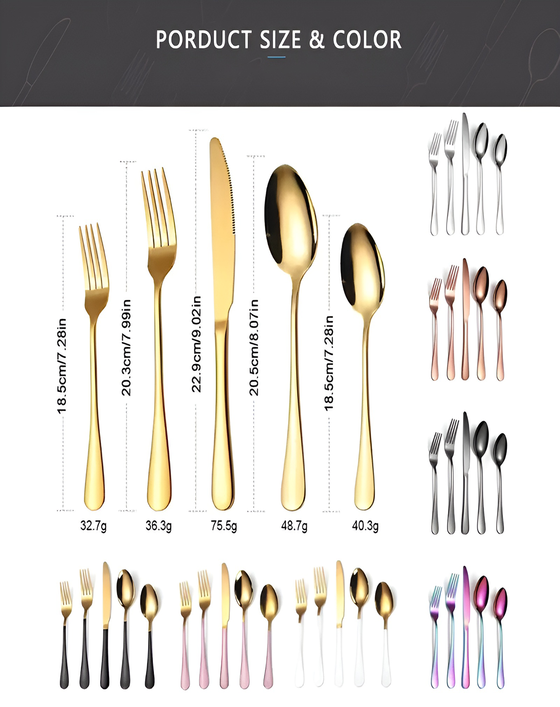 Set of 18 PCS (6 Spoons, 6 Forks, 6 Knives), Set of 24 PCS (8 Spoons, 8 Forks, 8 Knives) |