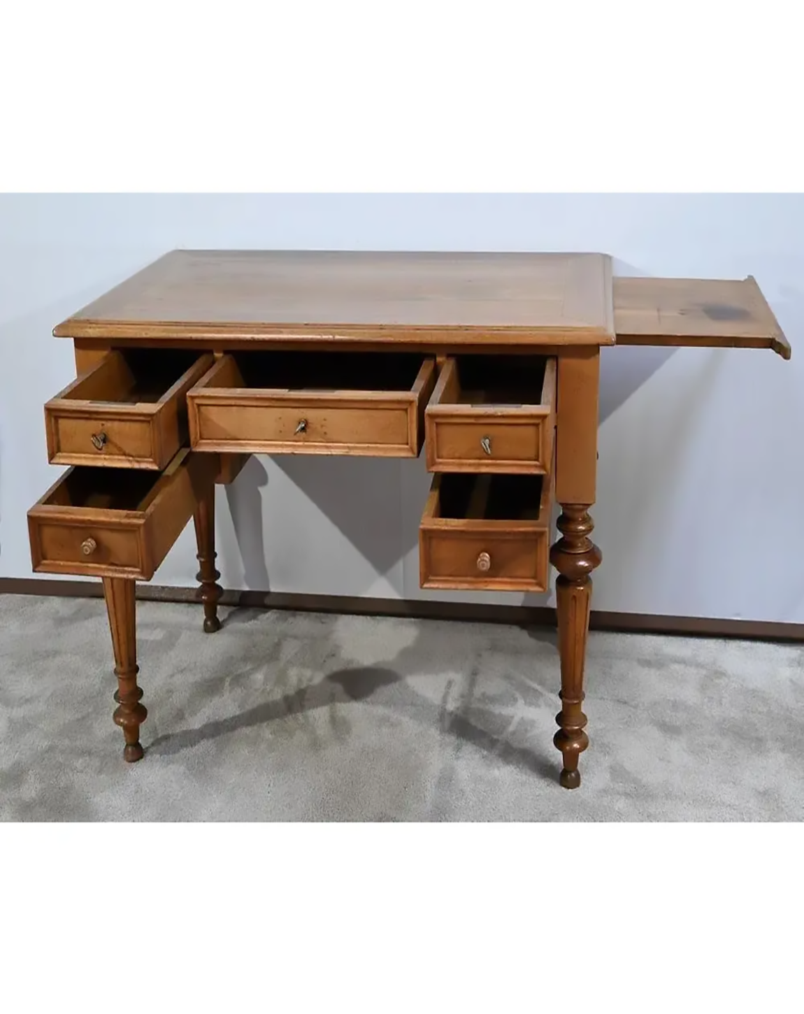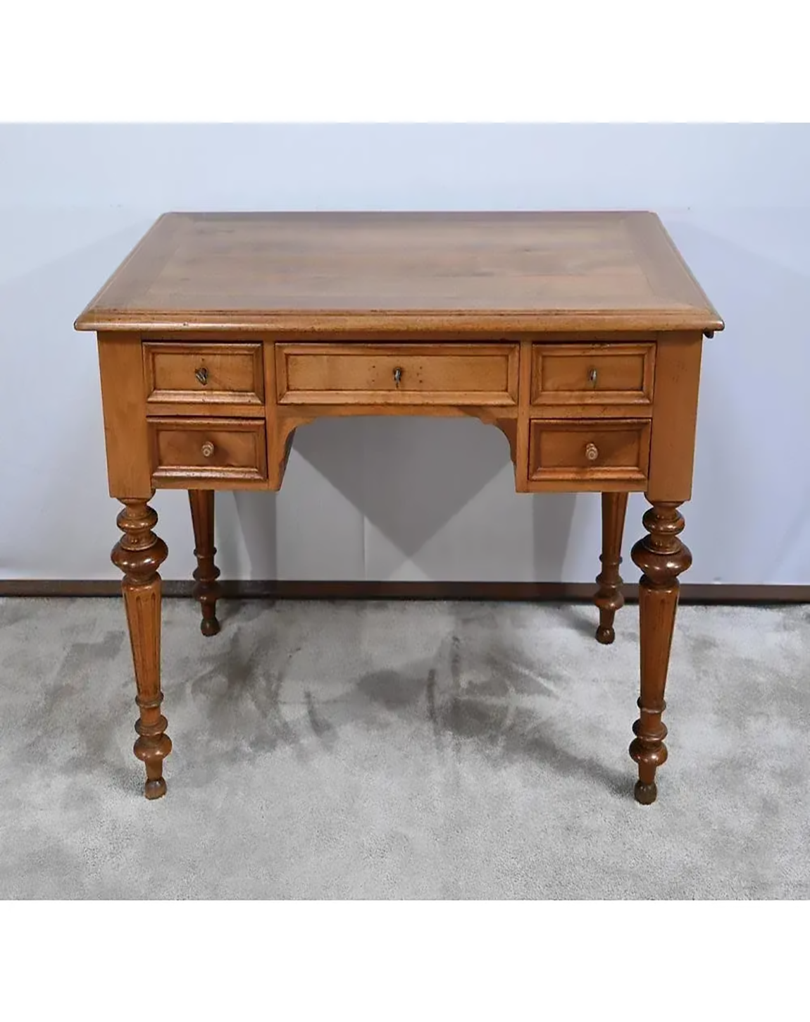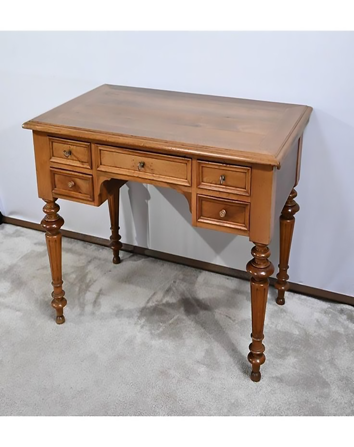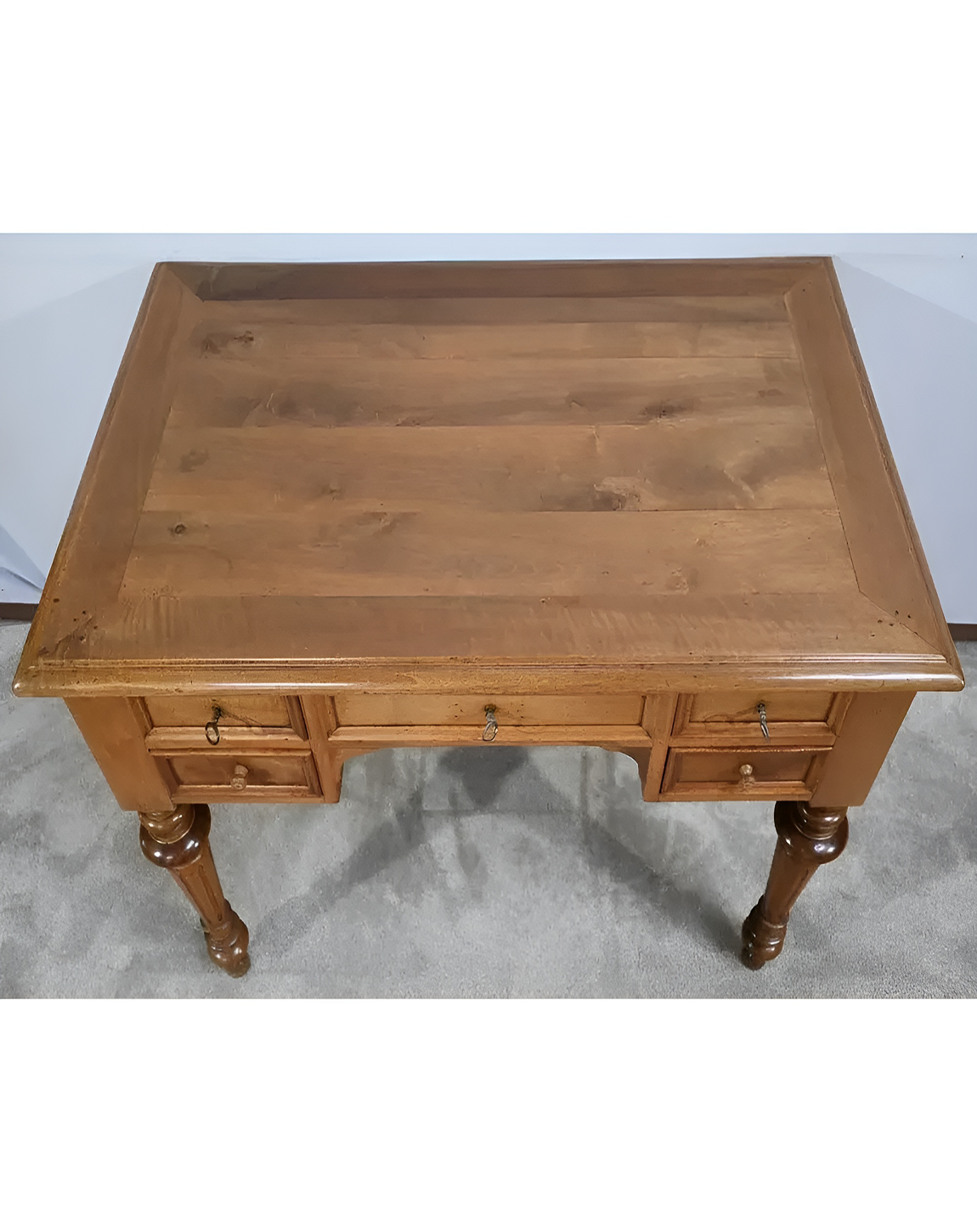 Oak Brown Desk: Desk Made of Board and Laminate with three drawers having metal knobs. It has sleek wooden legs.