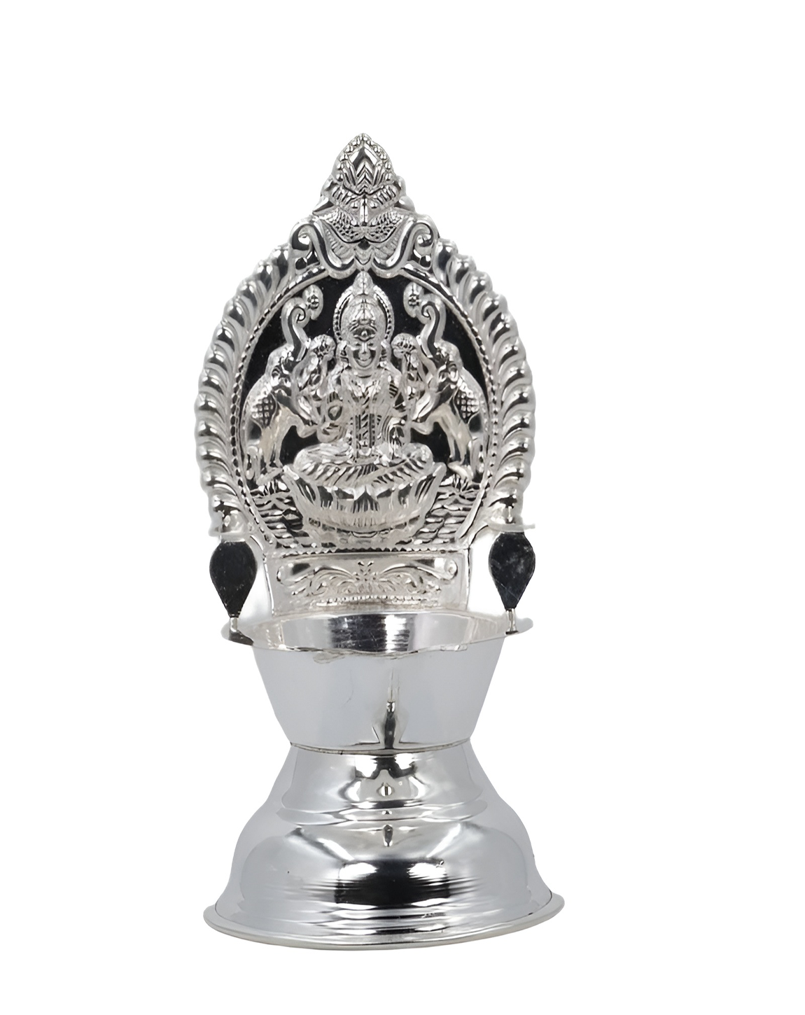 This exquisite silver plated Lakshmi Diya is perfect for your home. Beautifully crafted, it adds a touch of elegance to any decor. Use to light your home and bring in blessings of prosperity and good luck.