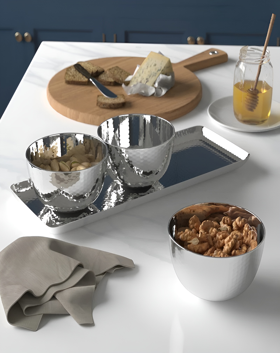 This set of 4 silver-plated bowls are perfect for adding a touch of elegance to any meal. Each bowl is small in size, perfect for side dishes and snacks. Ideal for both formal and casual dining, these bowls are sure to add a distinctive charm.